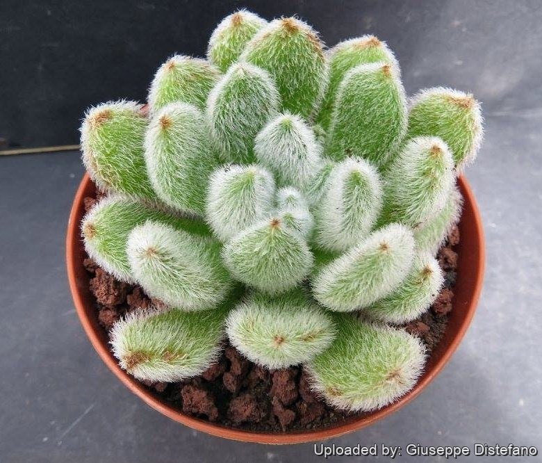 Leaves: Several, thick, obovate, much wider near apex than those of Echeveria setosaSN|12352]]SN|12352]] but less wide than those of Echeveria pulvinata, fresh green, and in the resting period coloured round the edges with deep pink and covered with thick long whitish hair.