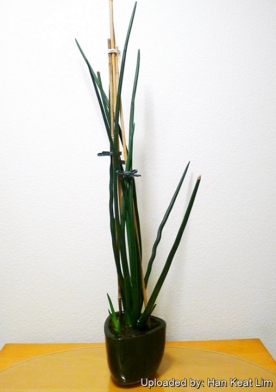 Description: Sansevieria erythraeae (Pencil Sansevieria) is a stemless rhizomatous succulent, growing in patches. It is similar to Sansevieria cylindricaSN|32202]]SN|15713]], but with leaves more numerous, significantly longer, round and upright, like a pencil. The leaves are dark green, smooth, has no cross-banding but does have some longitudinal lines that are raised. Delicately scented flowers in a tight panicles are produced in spring and early summer, and it is said that this plant is sometimes grown for its ability to purify the air with the scent of its flowers. The synonym, Sansevieria schweinfurthiiSN|15713]]SN|32202]], is often used for this plant in cultivation. It differs from the related species, Sansevieria fischeri, in having 6–8 leaves. In contrast, S. fischeri has solitary leaves.