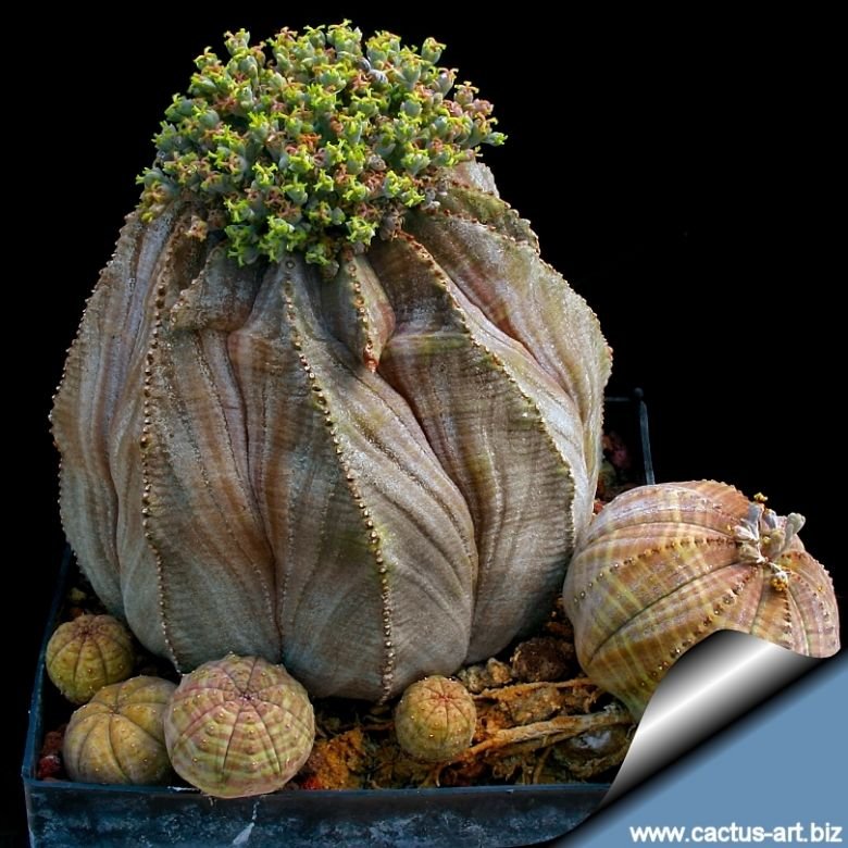 Notes: Euphorbia obesaSN|1966]]SN|1966]] is dioecious male and female flowers occur on different plants in summer, so a male and a female plant are needed for fecundation. The female has three protruding stigma on which the pollen grains stick, whereas the male has a hairy like center covered with yellow pollen. Once pollinated the female plant produces fruit containing 3 seeds each.