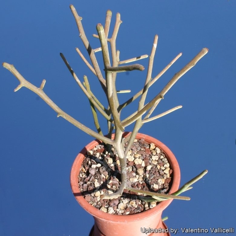 Stems: Grows with single or multiple trunks which support a tangle of pencil thick, cylindrical succulent branches, that are smooth and glabrous dark brownish-green, 5-8 mm in diameter. This plant is characterized by sympodial growth, that is the terminal bud of each twig abruptly dies and the growth is continued by lateral buds, season after season.