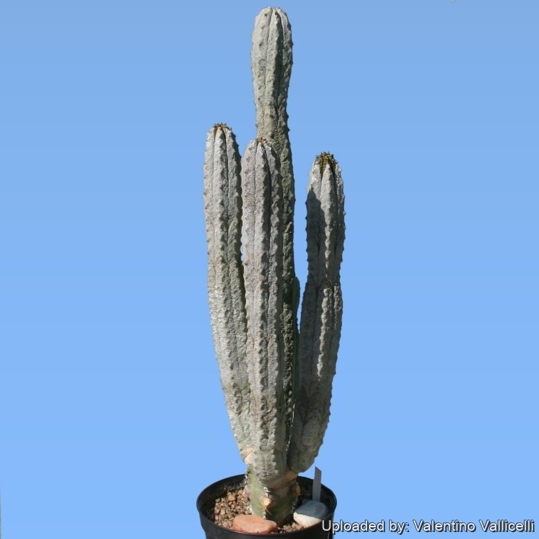 Stems: About 5 cm in diameter, pale greenish-grey, ash-grey to tan, columnar, more or less cylindrical, slightly constricted at intervals, spineless, simple, branching from the base or occasionally splitting dichotomously. Generally has 6 ribs with a somewhat wrinkled, worn looking 'skin' with slightly raised conical tubercles. Often skin peels away revealing greener tissues beneath. The colour of the new growth is grey-pink to dark brown and it will then turn to the grey tan colour. The latex is yellow viciously acrid and highly poisonous.