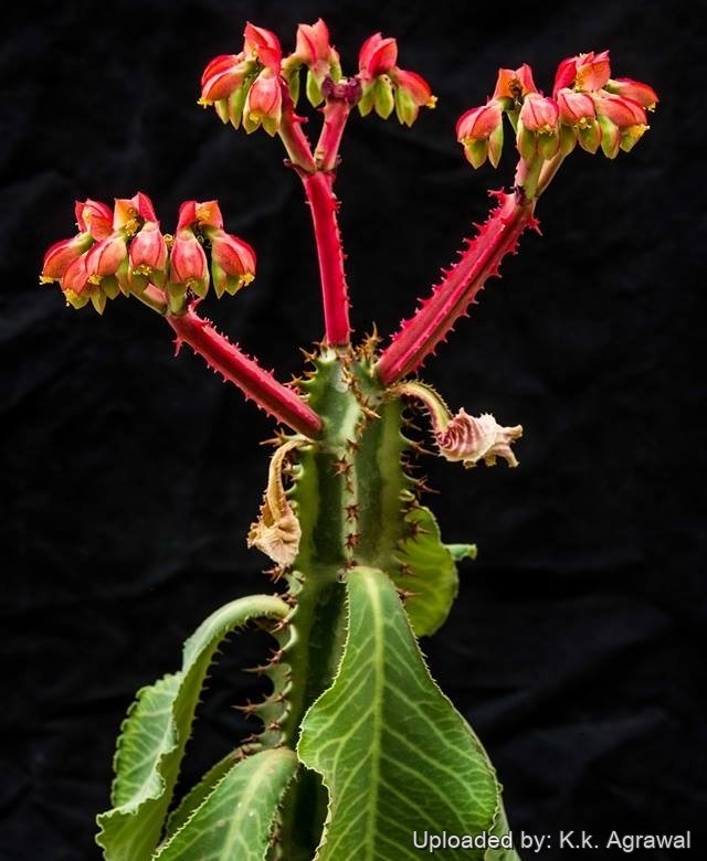 Flowers: Remarkably spectacular, born at apex of stem, small, dark-pink, enveloped in scarlet bracts and borne on long, rich red, quadrangular stalk that bears fewer cartilaginous prickles.