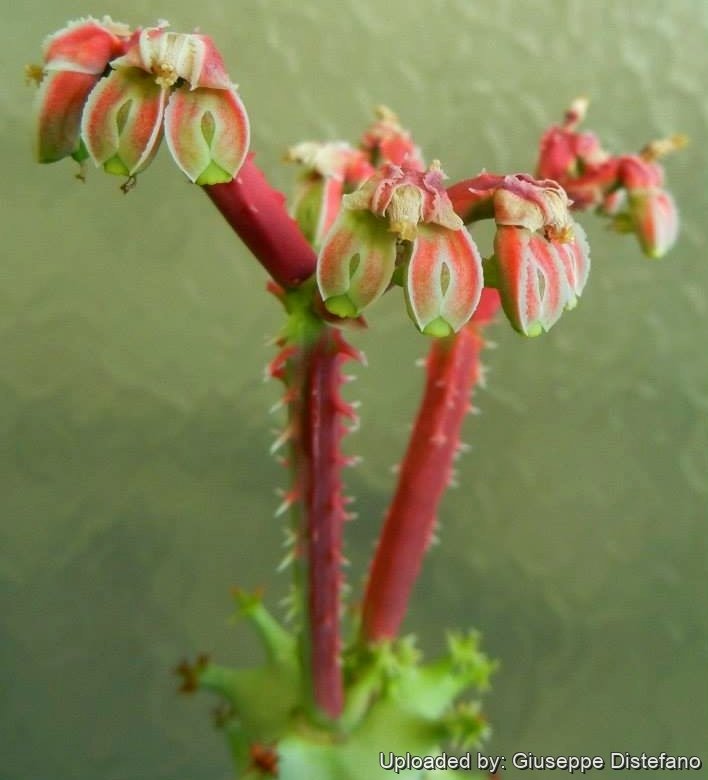 Description: Monadenium spectabileSN|29581]]SN|26554]] is a stout succulent shrub, with an unbranched or few-branched stem with cactus-like features that generally don't come into growth until the summer. The flowers are remarkably spectacular, born at apex of stem, small, dark-pink, enveloped in scarlet bracts and borne on long, rich red, quadrangular stalk that bears fewer cartilaginous prickles. It makes an incredibly ornamental potted plant and highly attractive to collectors.