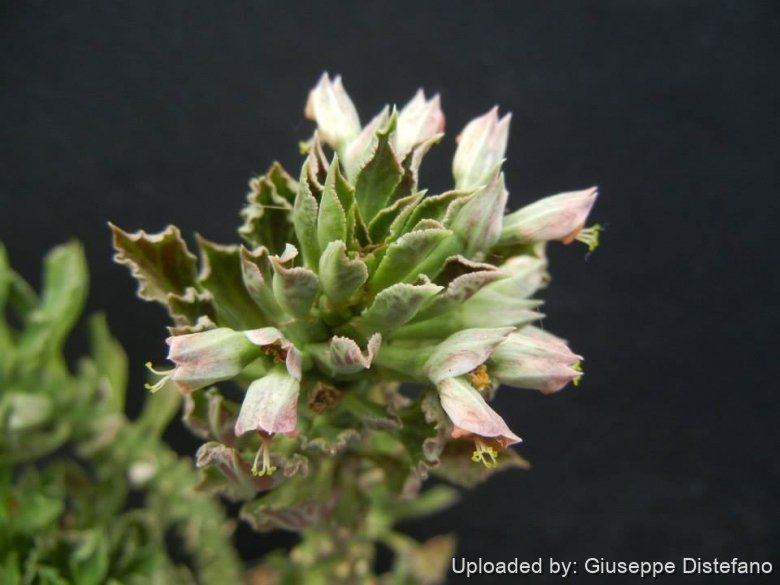 Inflorescences (cymes): Simple in the axils of the tubercles; peduncles 4-6 mm long, bearing 1–2 ciathya. Bract-cup oblique, 6-mm long, 5 mm broad, shortly and acutely 2-lobed at the apex, open in front, with the margins not nearly meeting, 2-keeled down the back, glabrous, greenish- white flushed pink or purple, lobes acute.