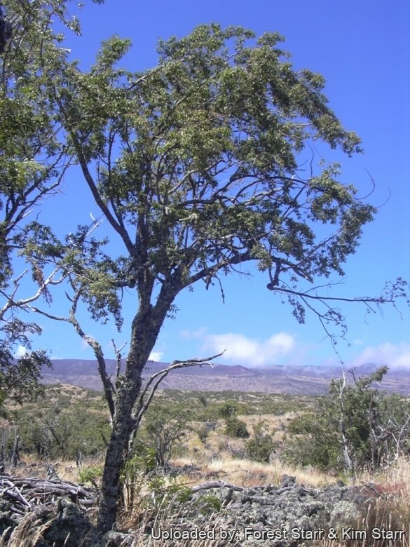 Habitat and Ecology: It grows in scattered stands in dry open forests. Above 700 metres this plant is found as a shrub, while at lower elevations 350 metres it is a 7.5 metres tree with a trunk diameter of 30 cm inches. Chamaesyce olowaluanaSN|28967]]SN|28967]] or akoko is an important habitat for at five species of native yellow-faced bees (Hylaeus spp.) most of which are exteremely rare and endangered. One is even named Hylaeus akoko. Disturbance caused by grazing, conversion to pastureland and the consequent invasion of introduced grasses increasing the likelihood of serious fires have all contributed to the decline in this habitat.