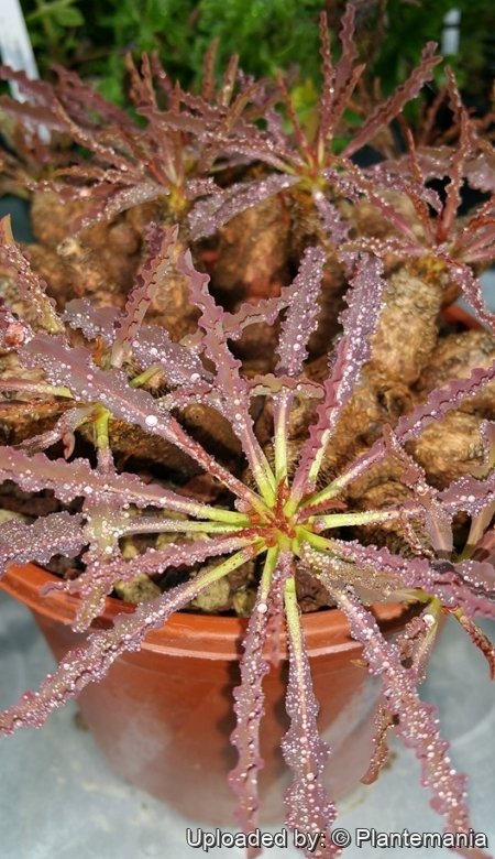 Watering: Water regularly during the active growing season. No water should ever be allowed to stand around the roots. Keep almost completely dry in winter. Even though the swollen caudex ensures a long lasting water reserve making it very tolerant of under watering, this euphorbia is difficult, turning immediately to mush when over watered, or watered out of season. Care must be given in watering, keeping them warm and wet while growing, and cooler and dry when dormant.