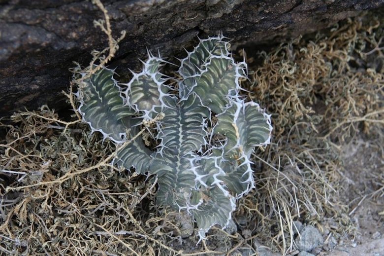 Description: Euphorbia cactus is a cactus-like spiny succulent-stemmed, shrub, up to 1(-3) m tall, much wider than tall, with arched branches, stems 3 (-4) angular, 3.6 cm wide, irregular segmented, dark grey green, the ribs handsomely edged whit short, paired thorns. Spiny ribs with continuous, grey border. Epidermis blue-green, marked with contrasting, wavy bands. Tiny, waxy, yellow flowers are produced along upper ribs in autumn. Euphorbia cactusSN|33881]]SN|33881]] is very variable especially in stem morphology.