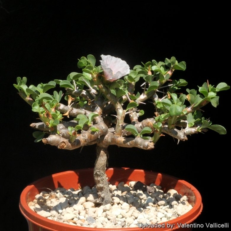 Description: It is a perennial, deciduous, succulent under-shrub, mainly low-growing, with wandering branches, 10-20 cm tall and 25 (or more) cm in diameter, forming a compact, spiny mat of growth in its desert habitat. It will drop it's leaves readily during drought periods and leaf and flower when water is available. The plant resembles a small tree and is very suitable for bonsai but always an attractive plant.