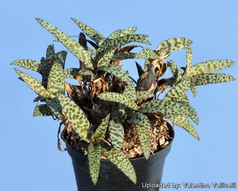 Leaves: 2 – 4, lance-shaped, strap-like, 4-7(-15) cm long and 1-2 cm wide, upright to spreading, fleshy, light silvery green, and basal with dark-green, turquoise, olive or aquamarine markings above and wine-red to purple beneath.